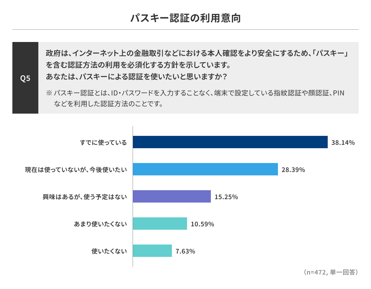 パスキー認証を「すでに使っている」(38.1%)と「今後使いたい」(28.4%)に加え、「興味はあるが、使う予定はない」(15.3%)も含め81.8%が関心を示しました。政府の必須化方針に対する期待が大きいことが読み取れます。
