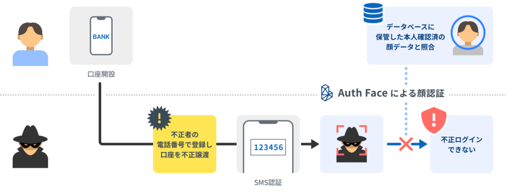 身元確認済みの顔データを事後に改ざんすることは極めて困難であるため、万が一パスワードやスマホ端末など他の認証情報が詐取されても、なりすまし不正を防止することができます。