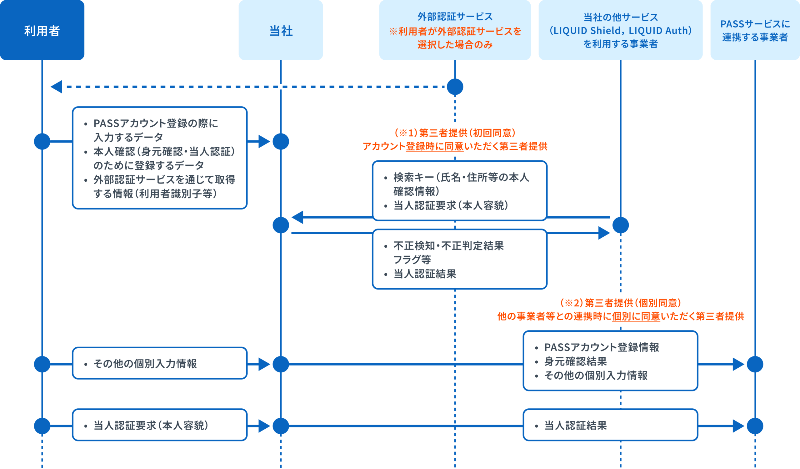 当社は、PASSサービスにおいて取得したパーソナルデータの一部を、当社が別に提供する不正検知サービス(LIQUID Shield)の利用時における他者によるなりすまし等の不正検知や不正判定結果等のフラグの値の返却および生体認証サービス(LIQUID Auth)の利用時における認証判定結果等のフラグの値の返却(※)の目的で、当社の別のサービスを導入・利用している第三者に提供することがあります。